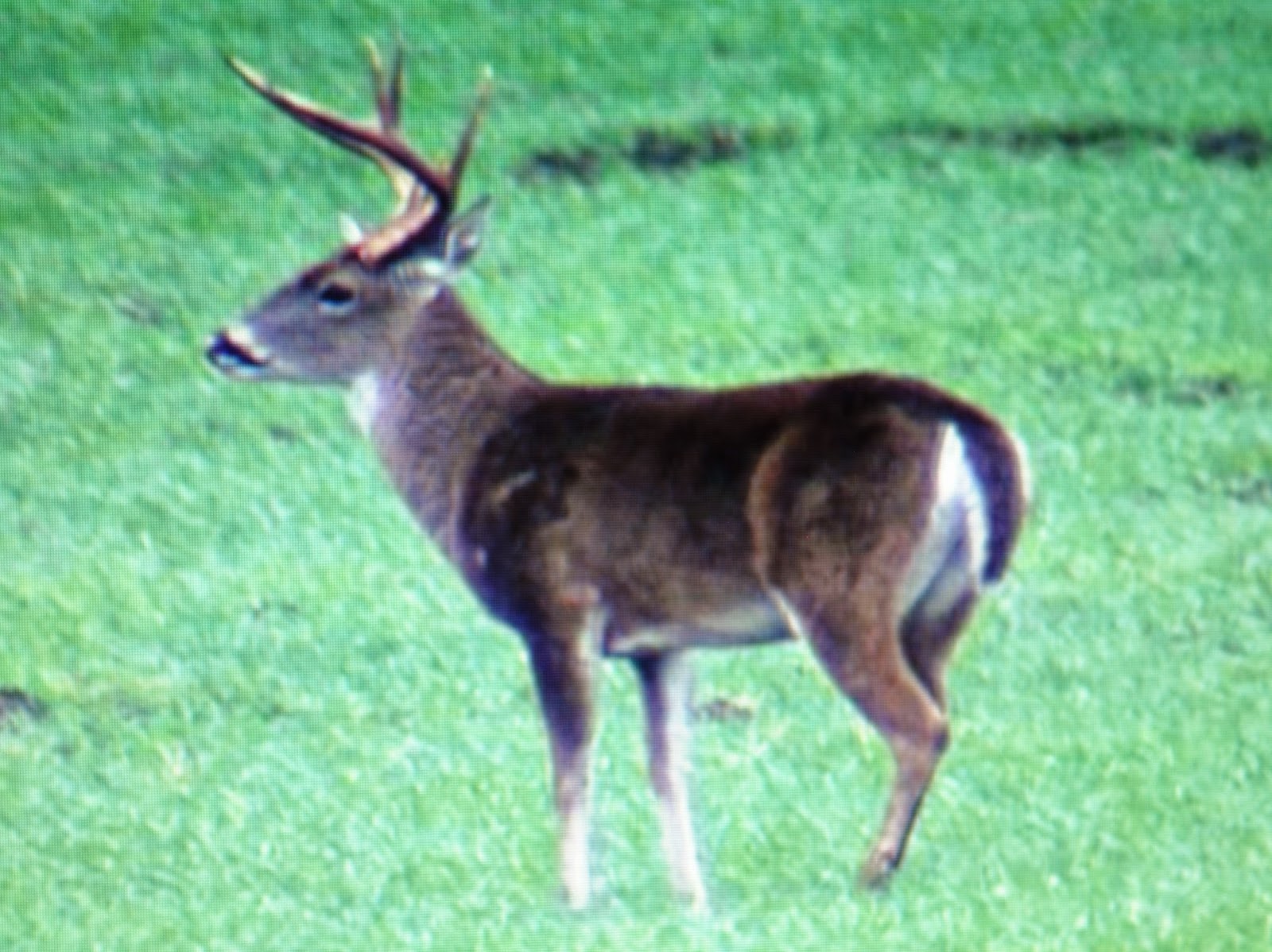Tim gave me the go-ahead to take the shot. The doe were bedded down and so was this nice seven-point. What we were hoping for happened pretty quick. Both doe got up and started across the field. You know what happened next -- the big seven-point got up and headed their direction.
